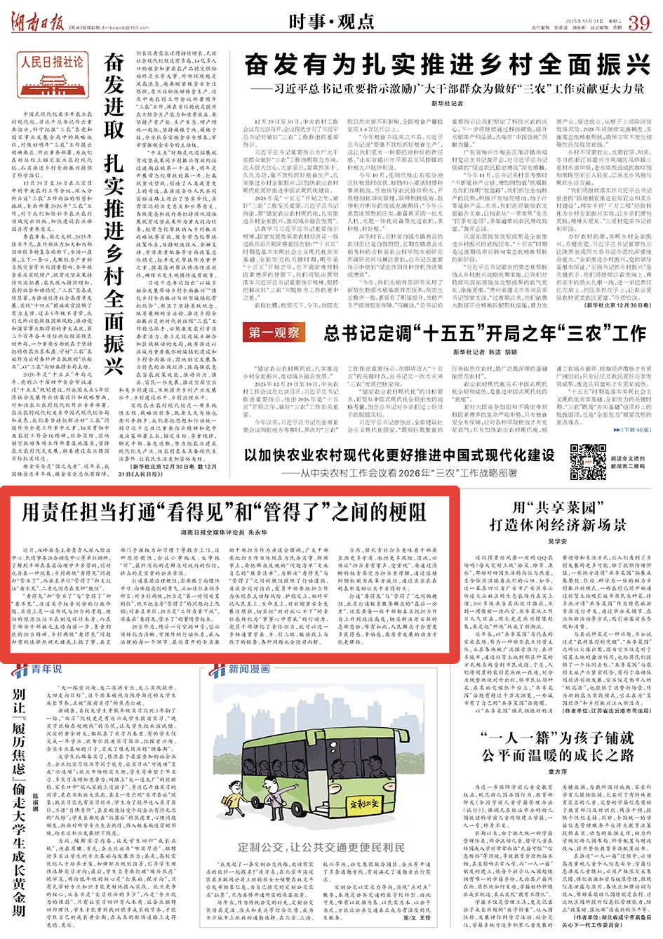 担当作为,绝非一句空洞口号,它必须转化为清晰、可操作的行动体系,嵌入治理的每一个环节。最近召开的全省激励干部担当作为座谈会强调,广大干部要把担当作为体现在为民办实事、解难事上,要把群众反映的“问题清单”变成自己的“履责清单”,为解决“看得见”与“管得了”之间的梗阻提供了行动遵循。座谈会同时指出,党员干部要把担当作为体现在主动防风险、护稳定上,始终牢记人民至上、生命至上,时刻绷紧安全发展这根弦,切实把“时时放心不下”的责任感转化为“事事心中有底”的行动力。党员干部强化了责任担当,就可以进一步畅通贯穿县、乡、村三级,联动线上与线下的链条,各种问题也会迎刃而解。