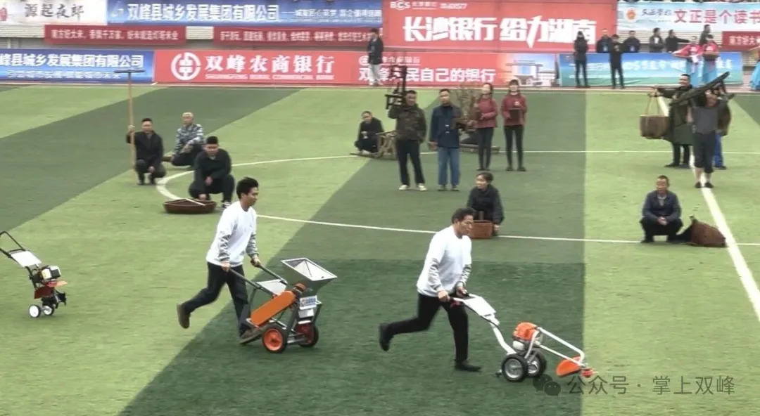 “农耕老炮儿”方阵率先登场——蒲滚、浪耙、铁耙、耕犁、板车……这些曾经在中国南方丘陵水田里唱主角的传统农具,由双峰的农民朋友们手持展示。紧随其后,由金峰机械的车间工人们兄弟们代表的“农机天团”自信地托举着高效粉碎机、微耕机、木薯机、多功能碎菜机等现代农机产品走上绿茵场,它们不仅是“湖南省名牌产品”,更是远销海外的“中国智造”。让群众站C位、当主角,让赛事成为百姓展示自我、表达情感的舞台,这是双峰办好本次赛事的初心,更是双峰践行“体育为民”理念的生动注脚。
