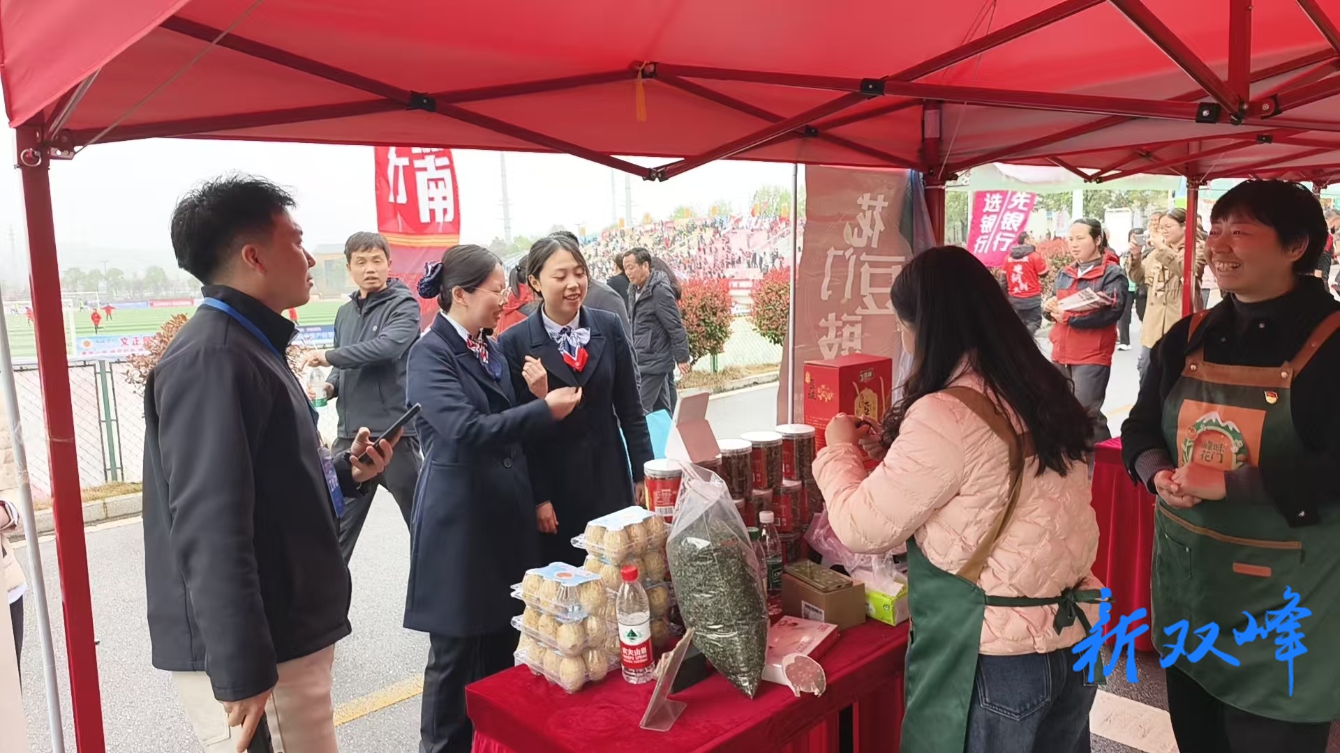 此外,全县构建“主赛场+第二现场+特色集聚”的多层次消费格局在华海荟、艺芳新天地、云端·紫云峰度假村大屏幕同步转播赛事,引入啤酒、烧烤、小吃等夜间经济元素。在赛场外设置农特产品展示展销区,“峰味花门”直播间里,主播们热情推介永丰辣酱、青树坪米粉、豆豉等双峰本土农特产品,借助赛事“出圈”带货。“看球还能买到正宗家乡味道,还有优惠,这球看得值!”一位满载而归的球迷笑着说。
