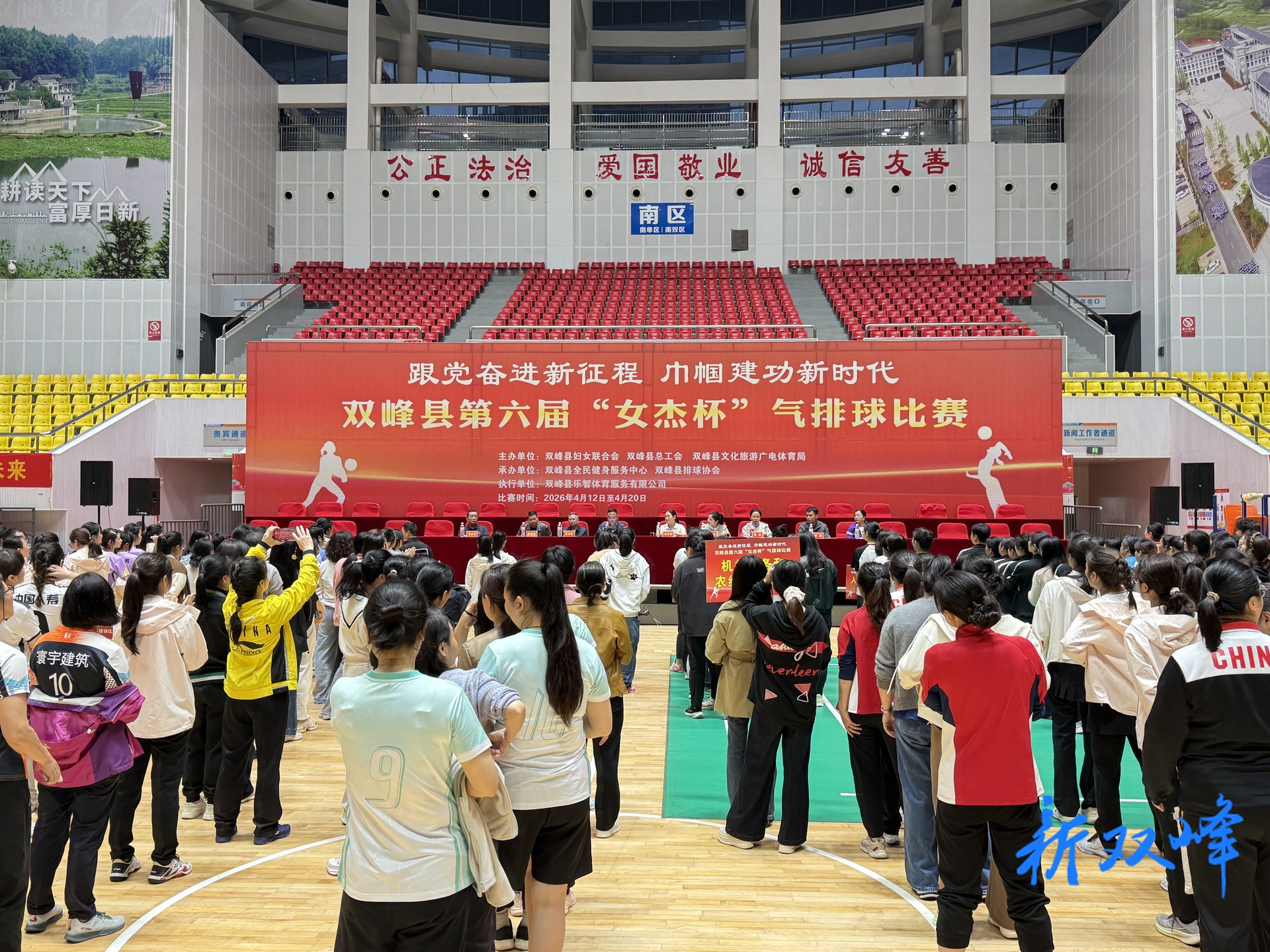 新双峰客户端4月14日讯(全媒体记者 吴勇波 通讯员 周济源4月13日晚,“跟党奋进新征程 巾帼建功新时代”双峰县第六届“女杰杯”气排球比赛在县体育中心开赛。