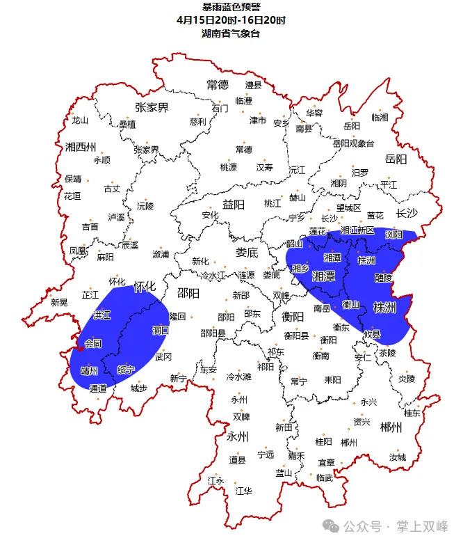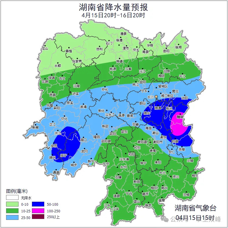 湖南省气象台4月15日16时发布暴雨蓝色预警:预计15日20时至16日20时,湘中部分地区将出现暴雨,其中株洲北部局地有大暴雨(110-120毫米),并伴有短时强降水(最大小时雨强30-50毫米)、雷雨大风(阵风8级以上、局地10级以上)、冰雹等强对流天气,请加强防范。蓝色预警区域:长沙南部、株洲中北部、湘潭、怀化南部、邵阳西部、衡阳东北部。湖南省气象台4月15日16时发布强对流蓝色预警:预计15日20时至16日20时,湘中、湘南部分地区将出现8级以上、局地10级以上雷暴大风、冰雹或短时强降水(最大小时雨强30-50毫米),并可能持续,请加强防范。蓝色预警区域:长沙南部、株洲、湘潭、怀化南部、娄底东部、邵阳西部、衡阳部分地区、永州南部、郴州部分地区。根据省气象局4月15日预报,省水利厅与省气象局联合会商得出如下结论:受降雨影响,15日20:00至16日20:00,衡阳市、长沙市、株洲市、湘潭市、邵阳市、怀化市等局地可能发生山洪灾害。黄色预警区域:渌口区南部,攸县大部,茶陵县北部,醴陵市大部,衡东县东部。根据地质灾害成灾规律和孕灾条件,结合2026年4月15日短期气象预报情况,省自然资源厅与省气象局联合会商得出如下结论:自4月15日20:00至16日20:00,受降雨影响,湘中、湘东的长沙、株洲、湘潭等市州山地丘陵区发生突发性地质灾害风险较高黄色预警。4月16日白天,湘中以南阴天有中到大雨,其中长沙南部、株洲中北部、湘潭、衡阳东北部、怀化南部、邵阳西部有暴雨,株洲(醴陵、攸县)有大暴雨,其他地区阴天有小到中等阵雨或雷阵雨;北风2~3级,雷雨时局地阵风8~10级;最高气温湘南25~29℃,其他地区21~25℃;最低气温15~19℃。16日晚上至17日白天,湘南小到中雨转多云,其他地区多云到晴天;夜间至17日清晨湘西、湘北大部分地区有雾;北风2~3级;最高气温22~27℃;最低气温15~19℃。17日晚上至18日白天,晴天;夜间至18日清晨湘西、湘北大部分地区有雾;北风2~3级;最高气温25~29℃;最低气温14~18℃。