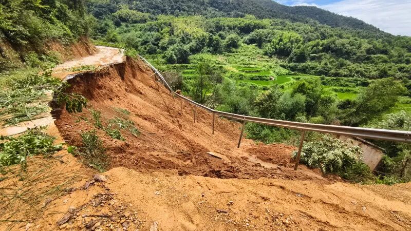 △强降雨引发滑坡,导致公路受损。冯兵田 摄