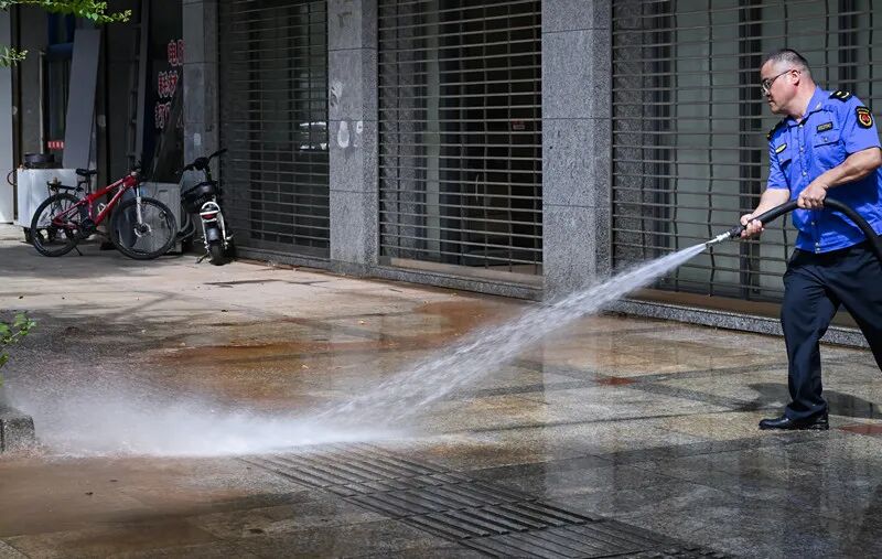 △7月29日,城管队员在清洗马路。刘新山 摄